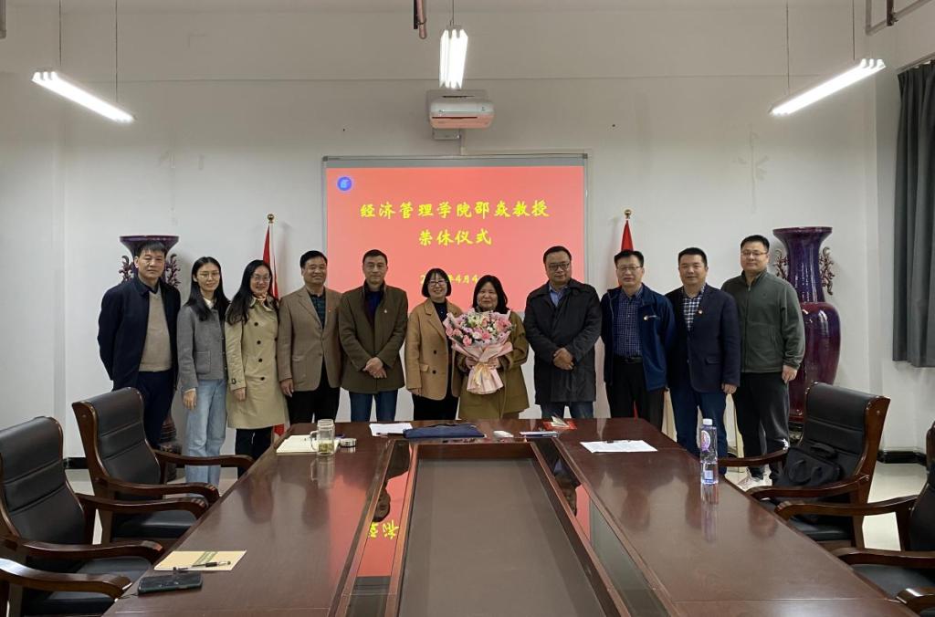 在会议室为邵焱教授举办了荣休仪式,温情欢送邵焱光荣退休。离退处处长郭亚红、学院领导班子、市场营销系全体教师出席了会议,会议由学院党委书记李向东主持。