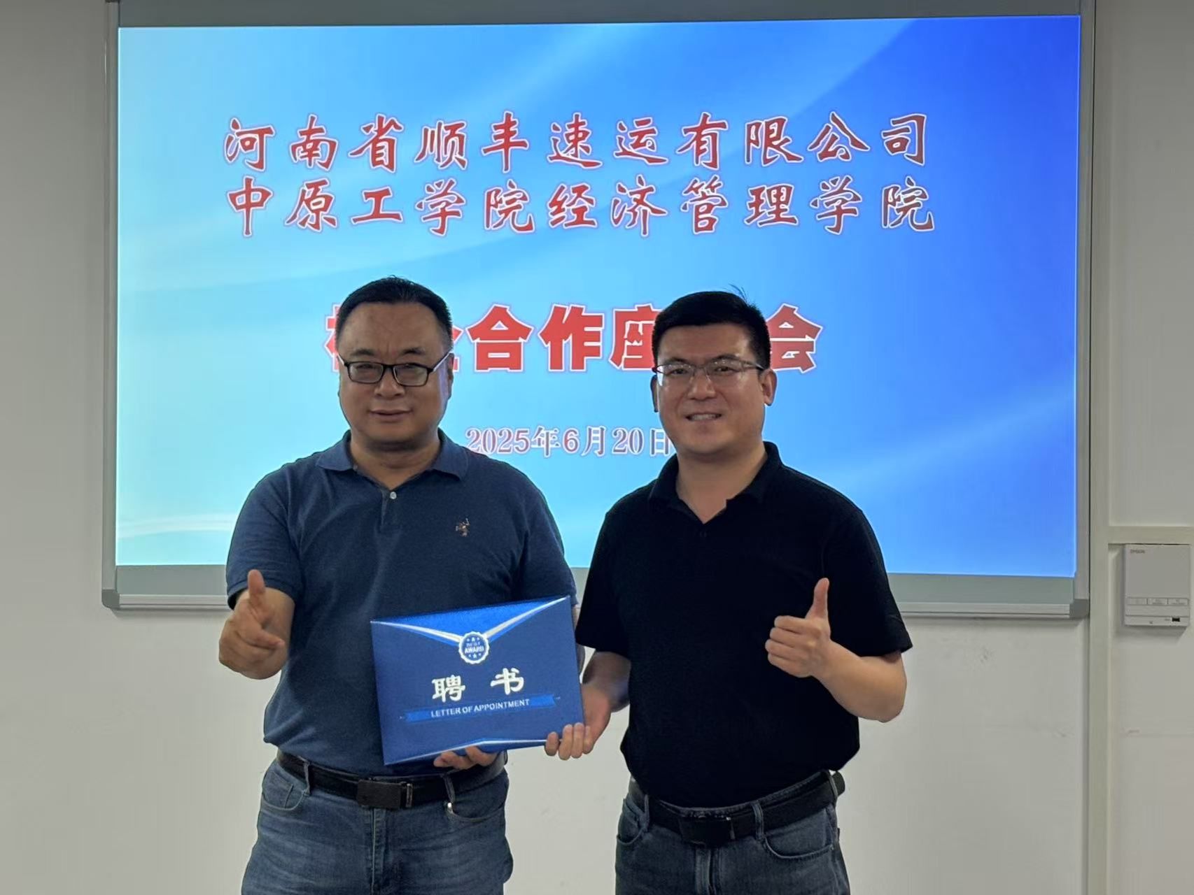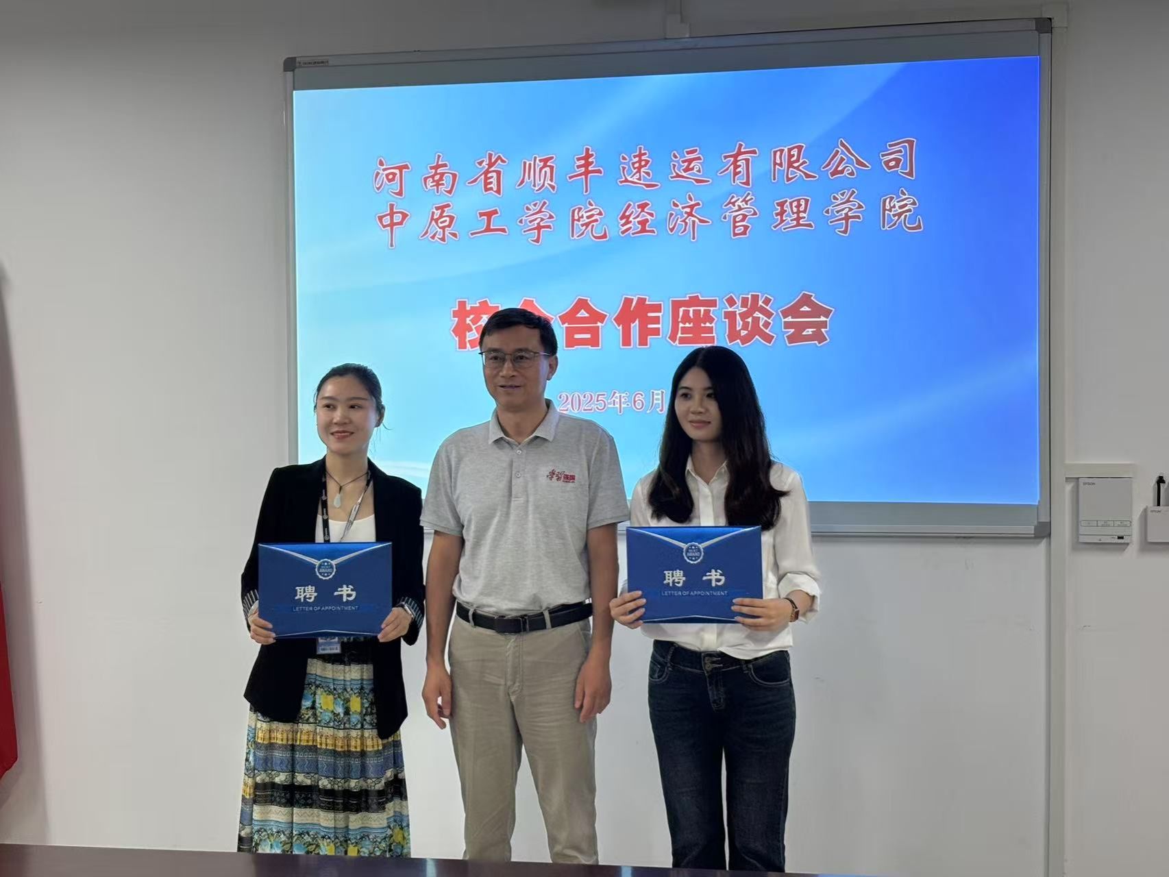 龙湖校区3号组团楼A306会议室就深化校企合作举行座谈会。顺丰集团河南区人力资源副总监杨楠,校招负责人杨静,大学生培训负责人李永佳;学院党委书记李向东,院长赵志泉,物流工程系主任李紫瑶,副主任兼党支部书记冯维玺,学工办副主任陈金出席会议。
