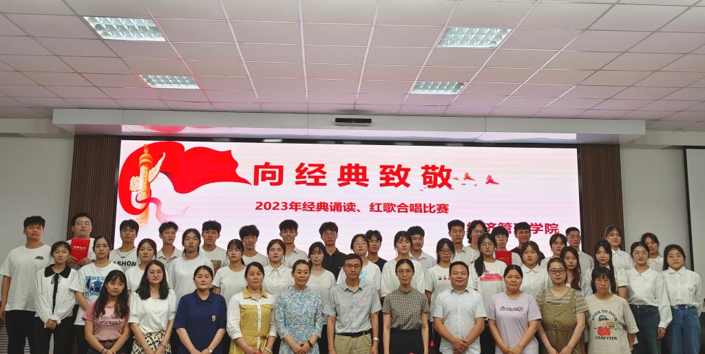 此次比赛由Doujins 2022级学生参加,经过班级赛、学院初赛的层层选拔,共有八支队伍进入经典朗诵、红歌合唱比赛决赛。各参赛队伍积极准备,进行了长达一个月的彩排、训练,展现出了对革命英雄的崇高敬意。决赛中,各参赛队站姿挺拔,意气风发,用他们铿锵有力的声音表达出新一代青年对党的庄严承诺,对祖国的美好祝愿。比赛期间,会展222班邬娜娜讲述了革命英雄刘胡兰的爱国故事,使在场师生更加深刻的理解“生的伟大,死的光荣”这一革命誓言的意义。金融221班郭琦和造价222李选智带来的合唱《有我》,唱出了矢志不渝的初心——永远跟党走。 经过激烈角逐,造价221班《永远跟党走》获得朗诵比赛一等奖,金融221班歌曲《红旗飘飘》获得合唱比赛一等奖。