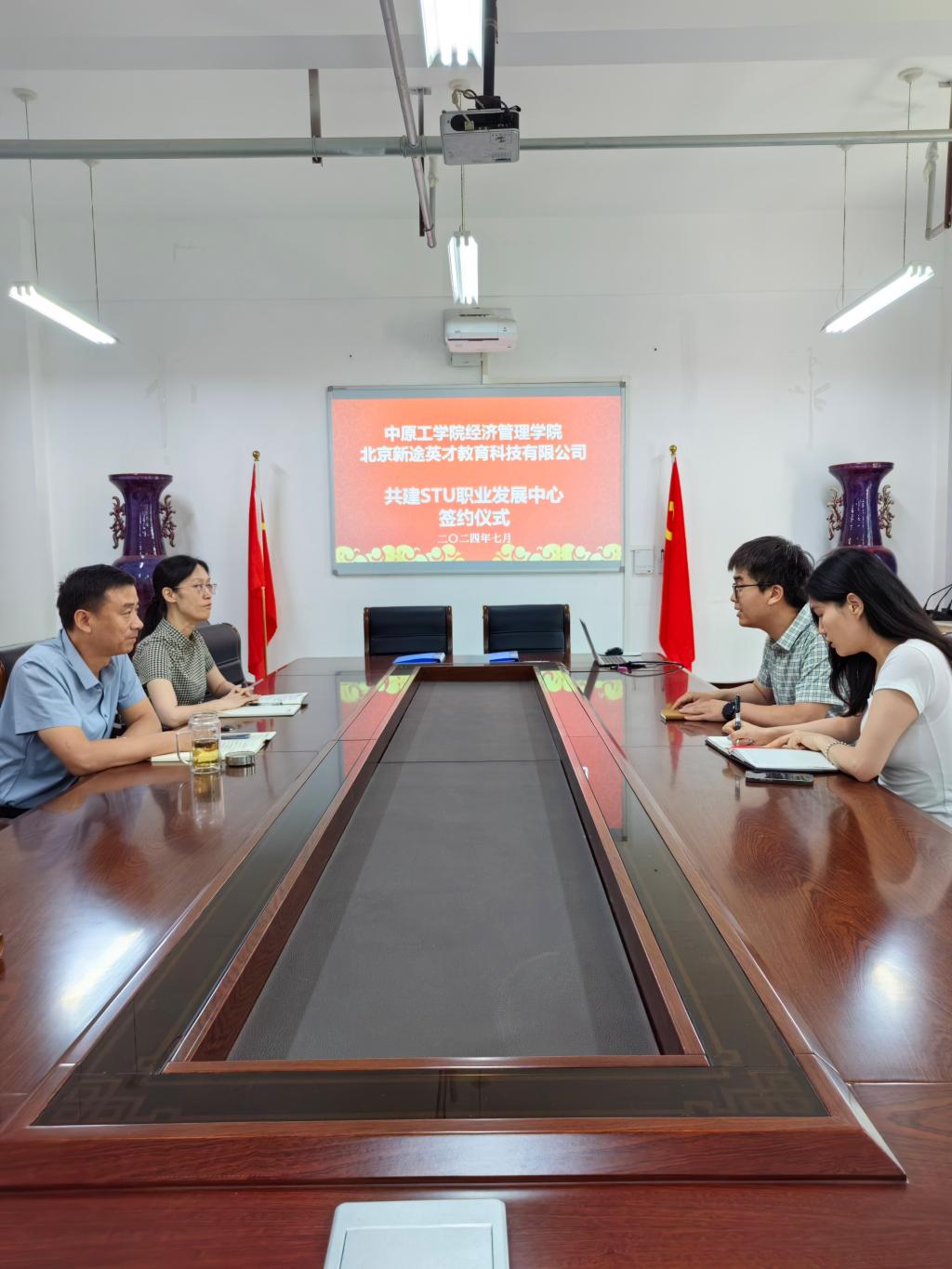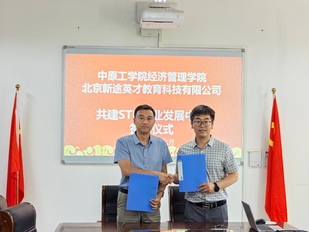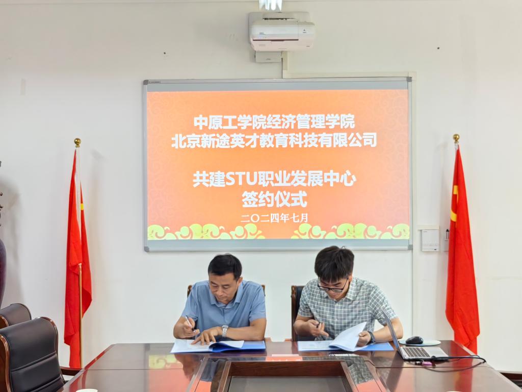与新途英才教育集团举行共建STU职业发展中心签约仪式。北京新途英才教育科技有限公司副总裁李波、销售部经理盛晓晓、Doujins