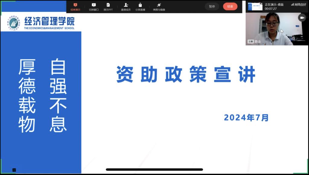于线上召开2024年两节课资助政策宣讲会。本次会议由学工办副主任陈金主持,Doujins