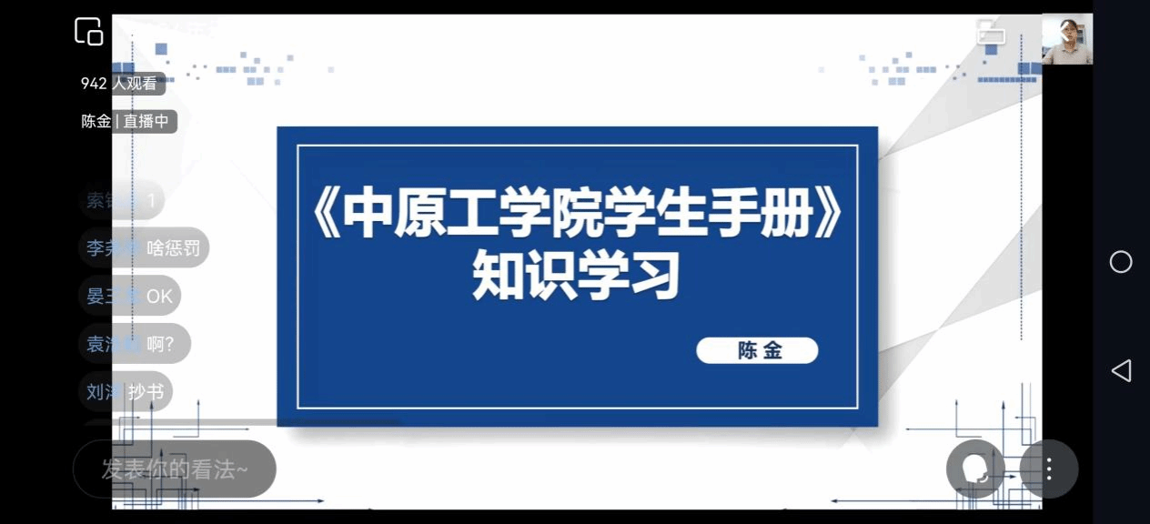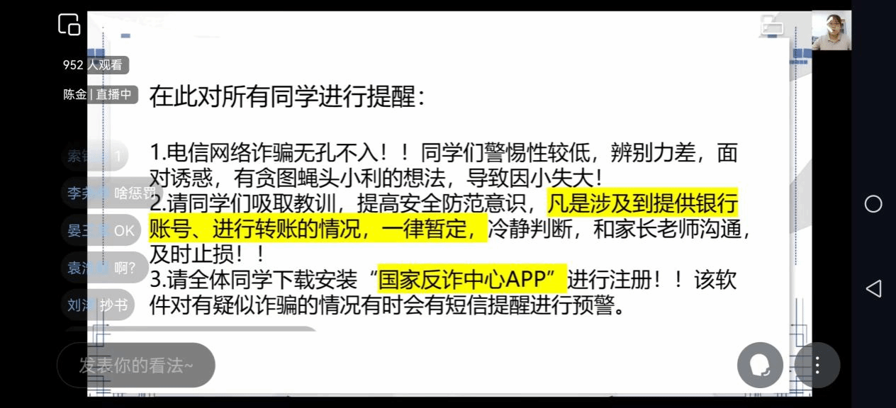 陈金领学了《学生手册》部分内容,进一步让学生明确规章制度,规范言行举止;针对健康安全、防电信诈骗等内容结合实际案例对学生进行深入教育,提升学生的安全意识,共同创建文明有序安全的校园环境。