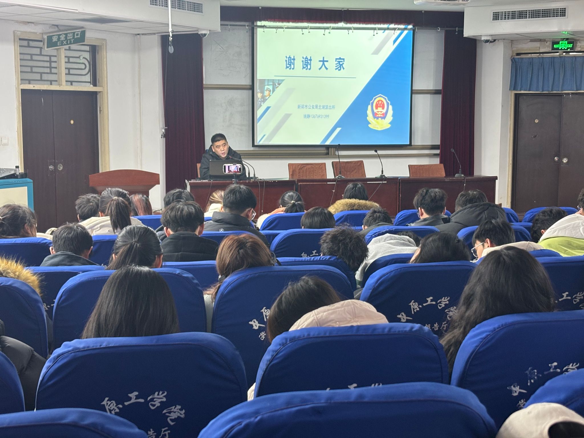 邀请新郑市公安局龙湖派出所民警姚静、校保卫处副处长邢军开展校园安全主题讲座。讲座以线上线下相结合的方式进行,全体2024级新生共1000余人参与。学院党委副书记王琳主持。