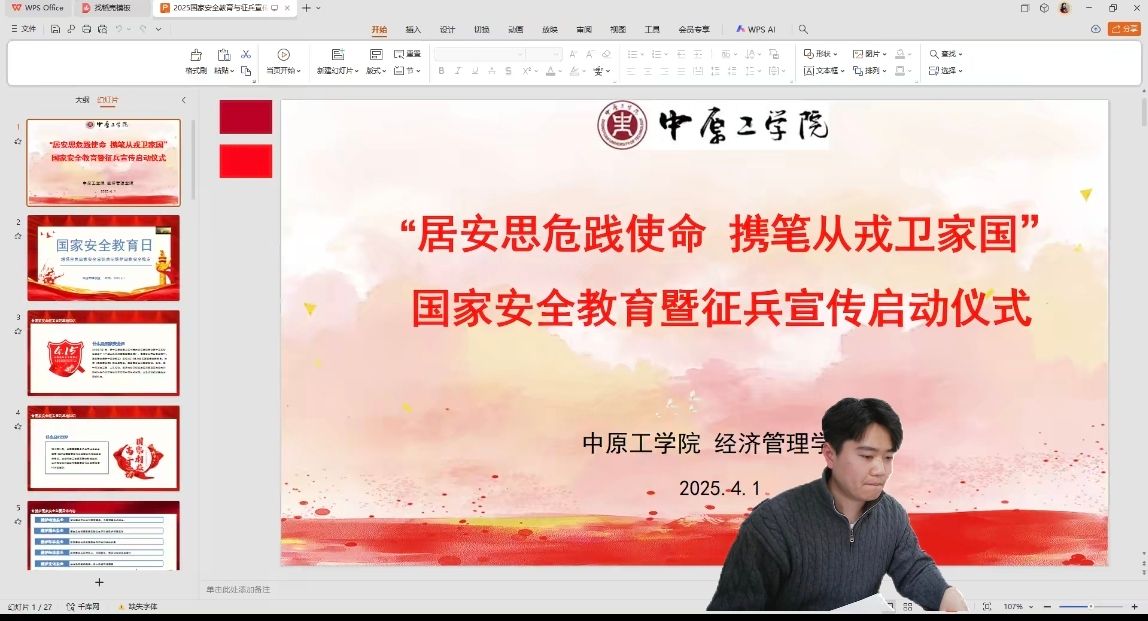 为强化大学生国家安全意识,激发参军报国热情,2025年4月1日,“居安思危践使命 携笔从戎卫家国” 国家安全教育暨征兵宣传启动仪式借助腾讯会议平台顺利举行。会议开始时播放了精心制作的国家安全和征兵宣传片。宣传片中,军队日常训练的热血场景、抢险救灾的英勇表现,以及国家安全领域取得的卓越成就,同学们对军队生活和国家安全的重要性有了更直观的认识。
