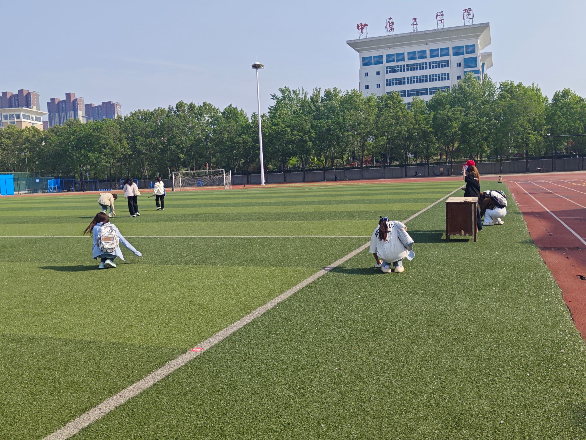 各支部组织志愿者们徒手清理操场垃圾。参与者放弃工具辅助,直接用手捡拾草丛和跑道上的烟头、纸屑,面对尖锐垃圾亦无退缩。徒手清洁让大家更直观感受到环保的紧迫性,强化了守护环境的使命感。