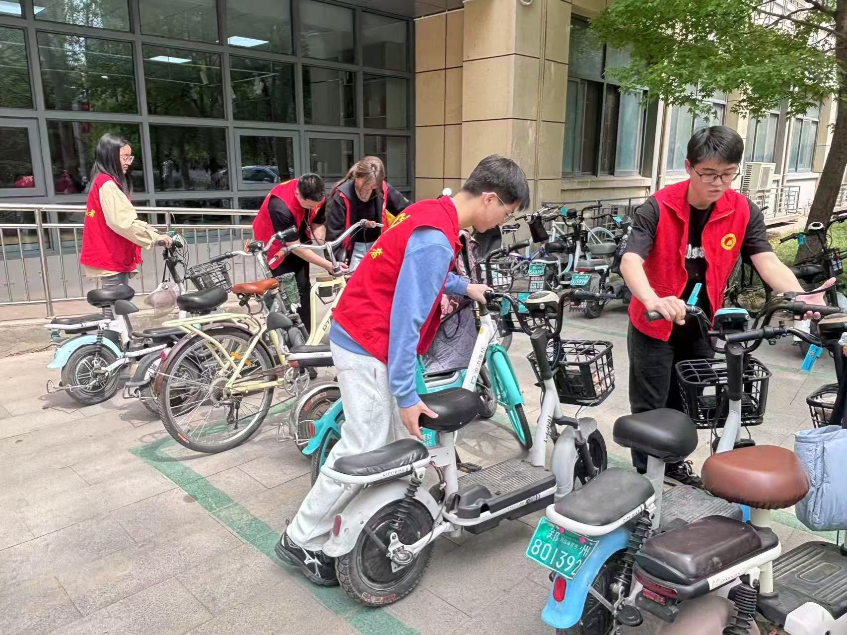 各支部带领党员、入党积极分子开展自行车整理专项行动。志愿者们分组协作,将乱停放的车辆归位至指定区域,清理周边垃圾,并向师生宣传文明停车理念。经过努力,原本杂乱的停车区焕然一新,道路畅通有序。
