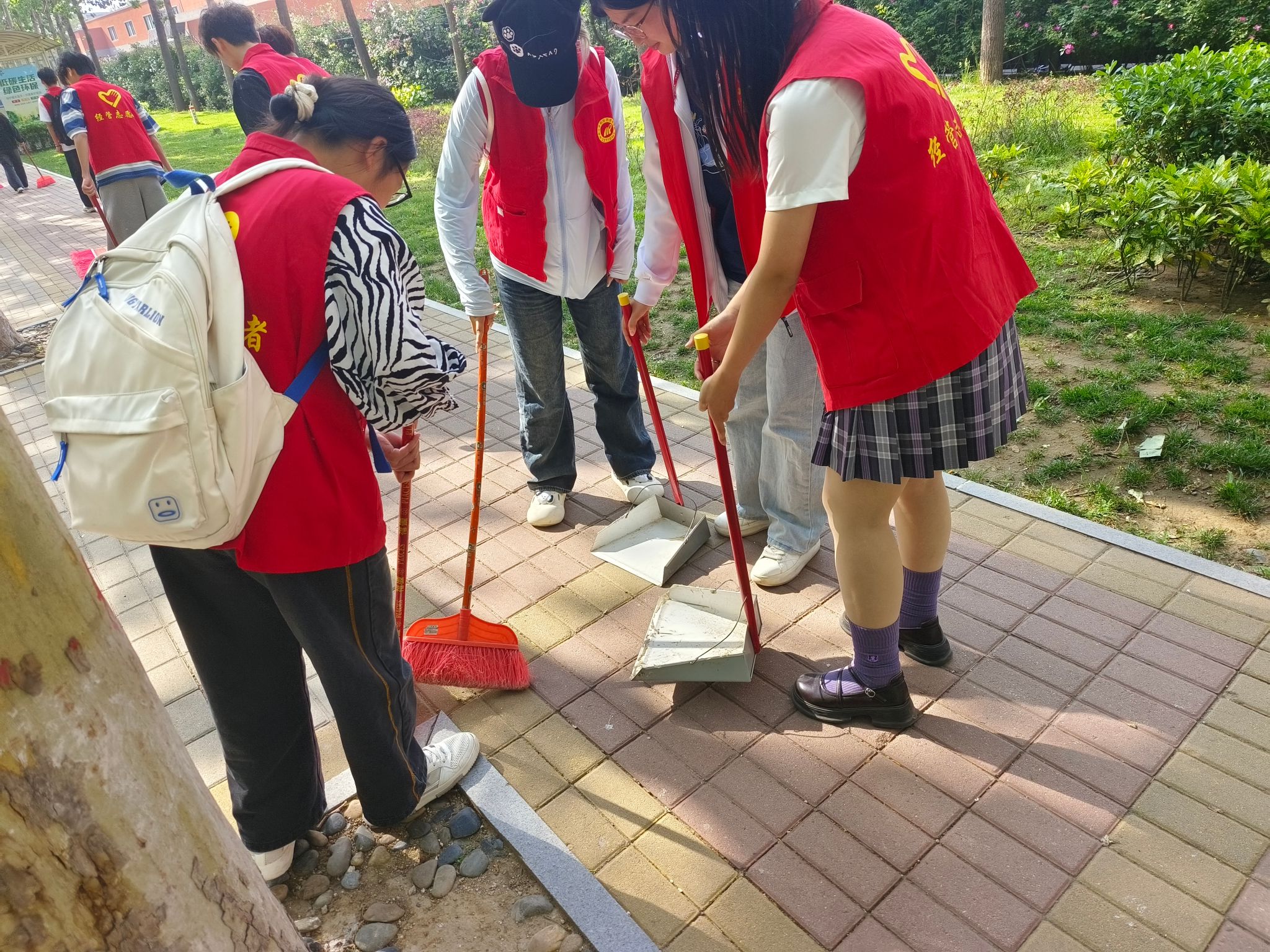 志愿者们身着统一服装,手持扫帚、簸箕等工具,分组投入到校园清扫工作中。他们不怕脏、不怕累,认真清扫地面、草丛,还仔细擦拭公告栏,清除灰尘污渍,让校园“信息窗口”恢复明亮。