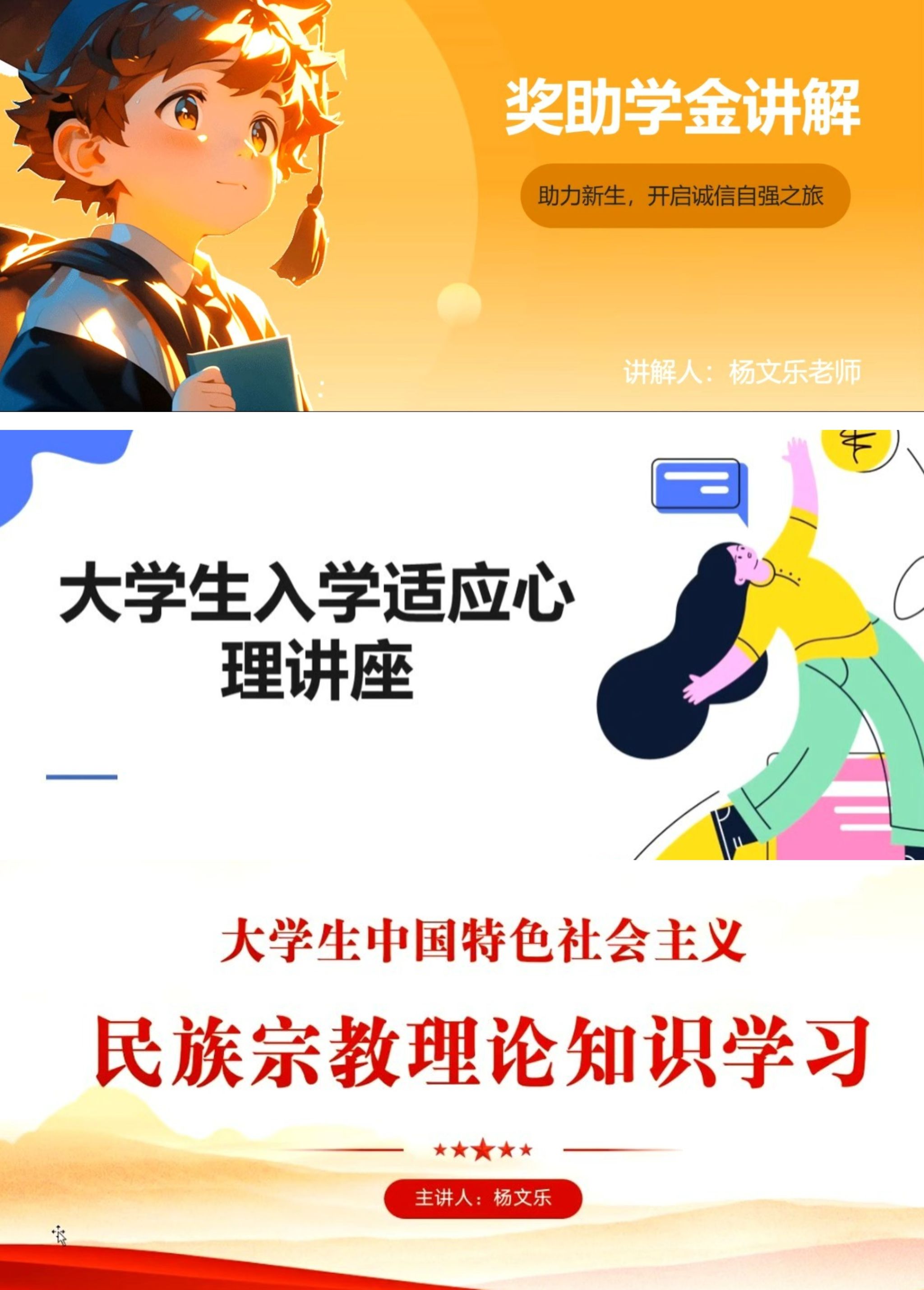 心理健康启新颜:杨文乐首先介绍了国家全方位资助体系政策,鼓励新生凭借自身努力在大学舞台实现价值提升。同时,以专题讲座形式向新生重点介绍如何适应大学环境并走好第一步、常见心理问题识别与应对技巧。